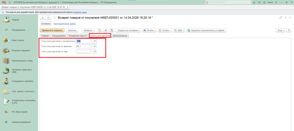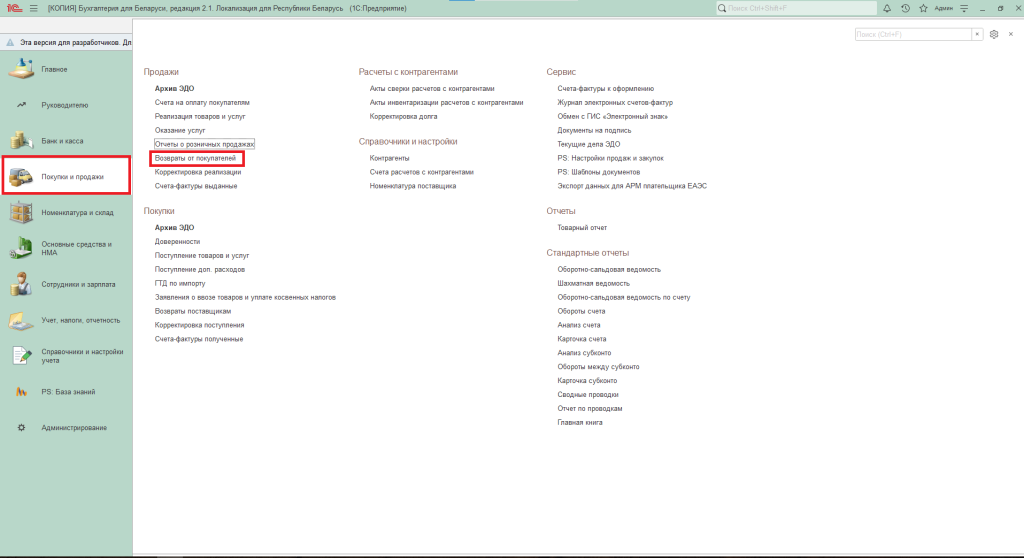 Для документального оформления возврата тары от покупателя используется документ «Возврат товаров от покупателя», расположенный в разделе «Покупки и продажи».