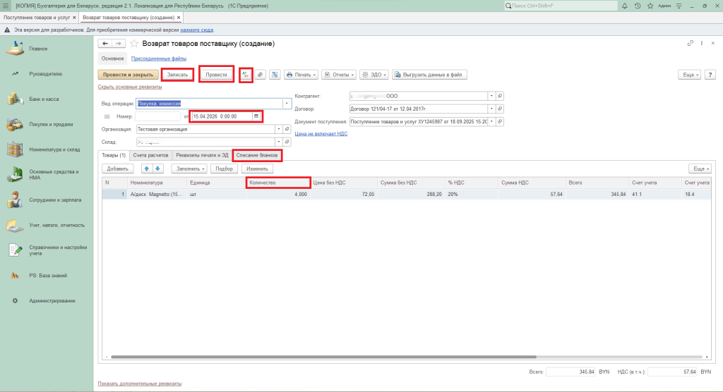 На экране появится уже предзаполненный документ, в котором при необходимости можно изменить количество товара, скорректировать дату или указать списанный бланк строгой отчётности. После внесения правок проводим возврат и проверяем корректность сформированных бухгалтерских проводок.
