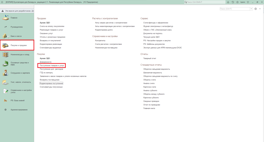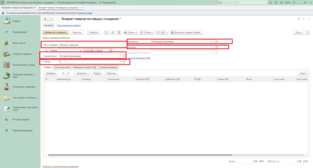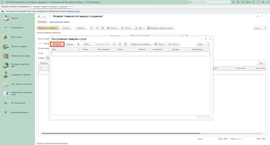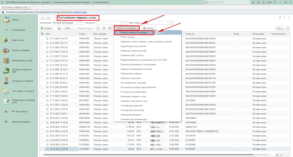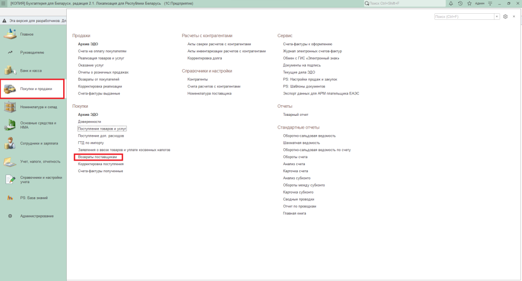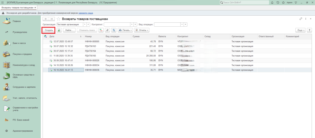 - Вкладка «Покупки и продажи» – «Покупки» – «Возвраты поставщикам».