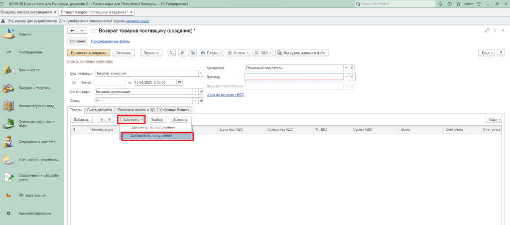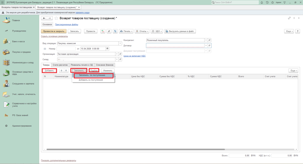 Также табличную часть можно заполнить по кнопке «Заполнить» – «Заполнить по поступлению» или через кнопку «Подбор».