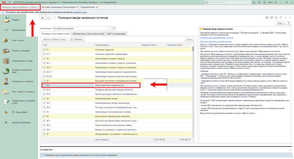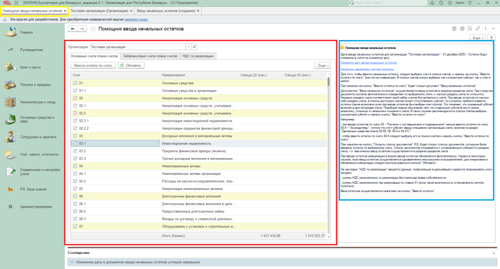 В правой части окна выделенного "синем цветом" «Помощник ввода начальных остатков» содержится краткая подсказка с порядком ввода остатков. Также в этом окне выделенным "красным цветом" представлен список в виде оборотно-сальдовой ведомости, где по мере заполнения данных показываются суммы начальных остатков по дебету и кредиту.