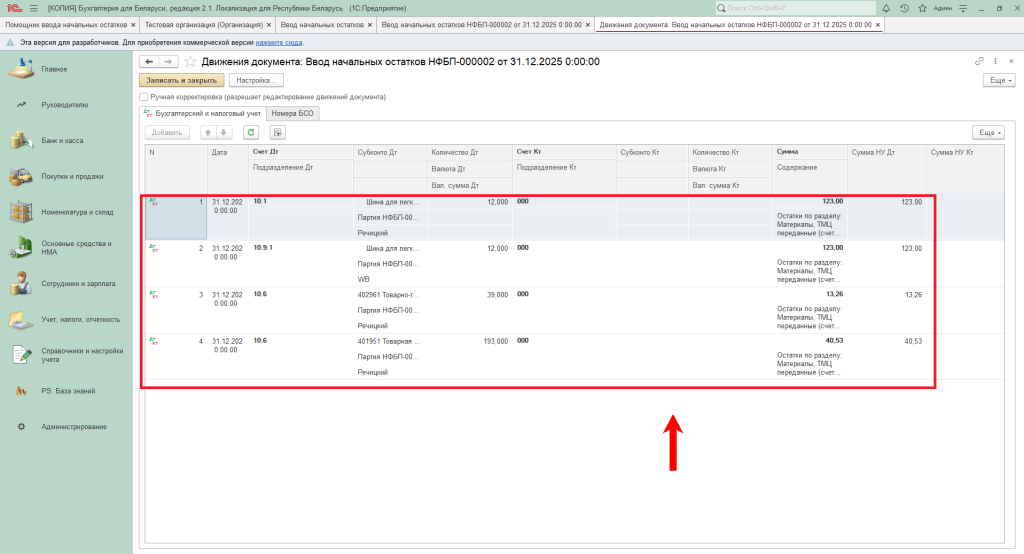 Далее откроется документ ввода начальных остатков по выбранному счёту.