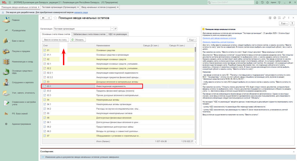 Для того что бы задать остатки для бухгалтерского и налогового учета необходимо нажать на вкладку "Помощник ввода начальных остатков" и выбрать "счет" из представленного списка, и нажать на выбранный счет.