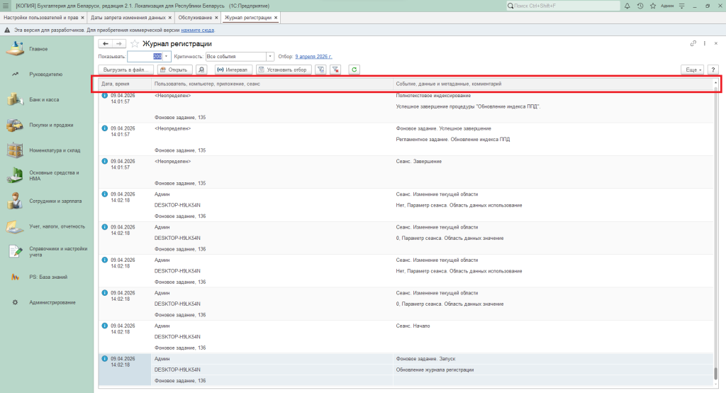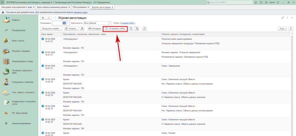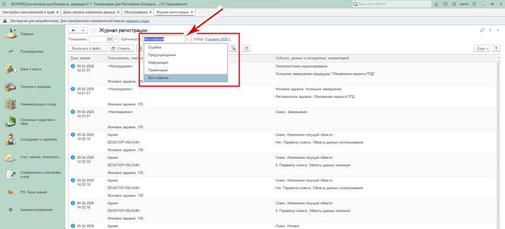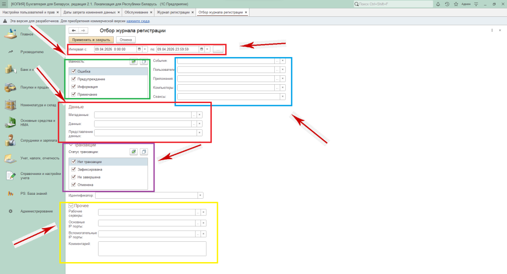 То у пользователя есть возможность отбора журнала регистрации, задать интервал, по важности отобрать, что необходимо в дальнейшем отразить, а также выбрать «Данные», «Транзакции» и прочее.
