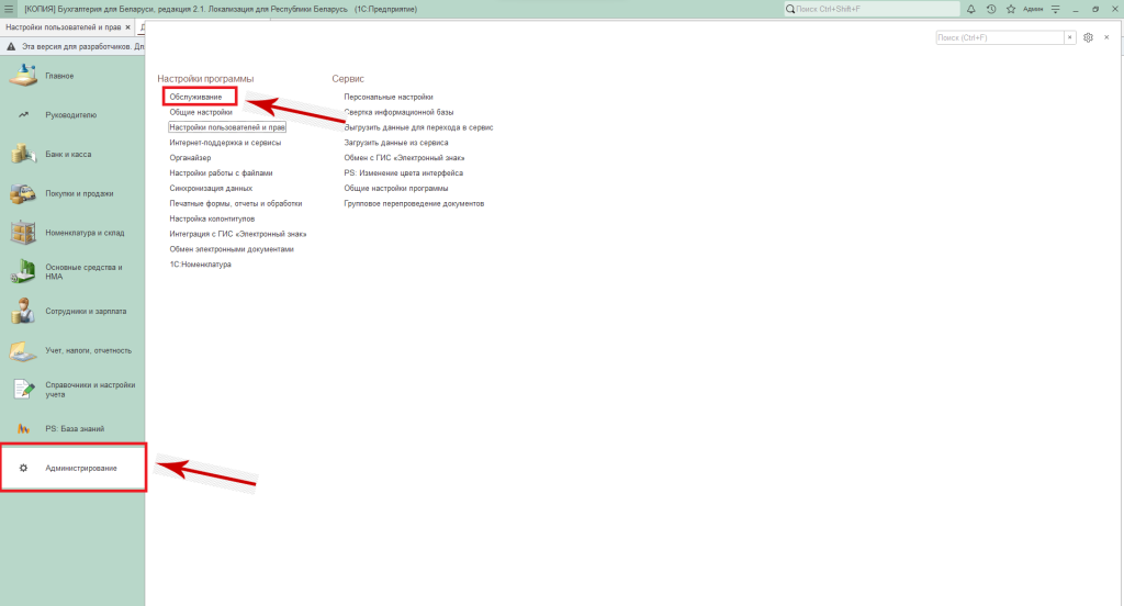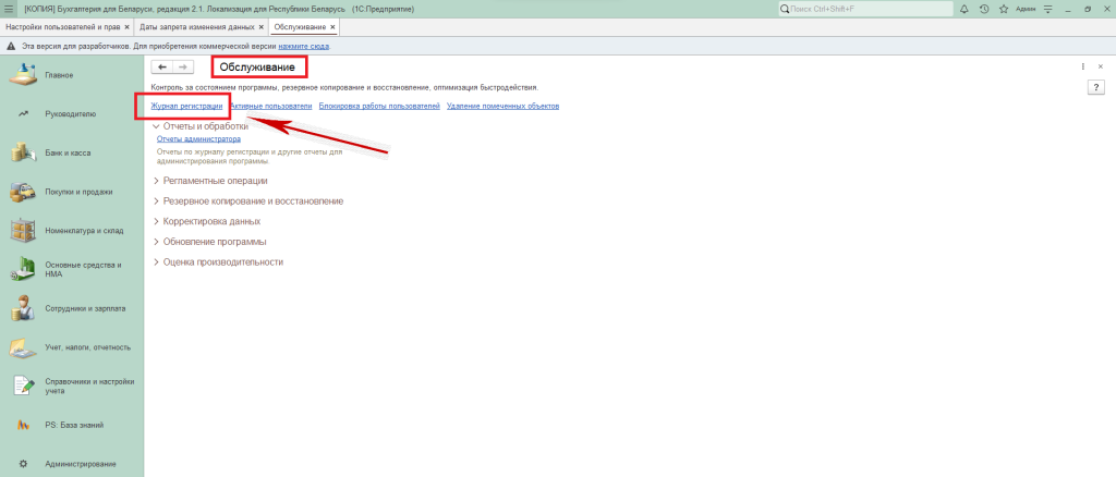Для того, чтобы попасть в «Журнал регистрации «необходимо зайти в раздел «Администрирование» — «Обслуживание».